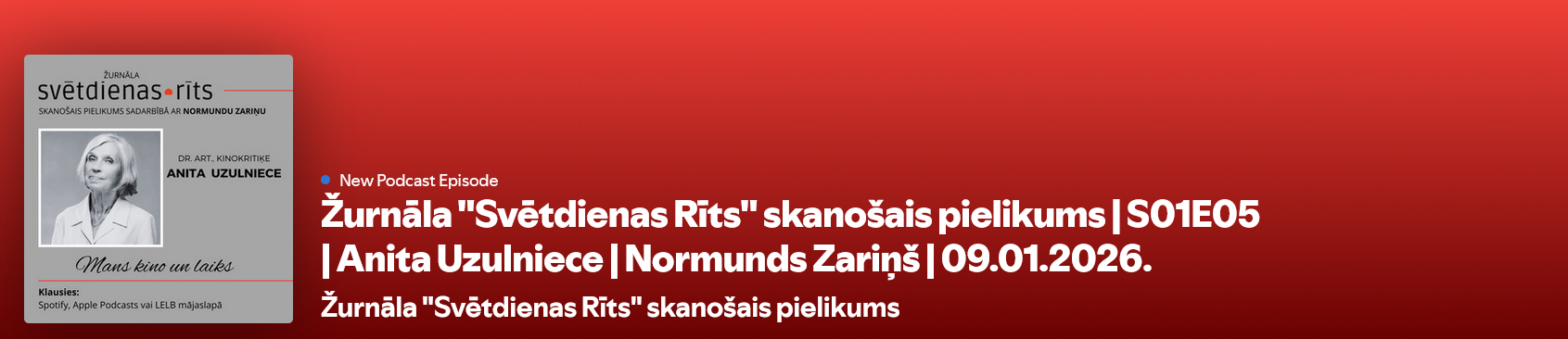 Manuprāt, tieši rudens un ziemas vakari ir tie, kad ietinušies siltā segā vai seģenē, ar tējas krūzi un kādiem našķiem līdzās, vairāk laika veltām grāmatu lasīšanai vai kino. Tāpēc, šajā epizodē piedāvāju jūsu uzmanībai sarunu ar mākslas zinātņu doktori, kino zinātnieci un kritiķi Anitu Uzulnieci. Mūsu saruna par kinomākslas kultūru, paradumiem un vērtību laiku mainībā.