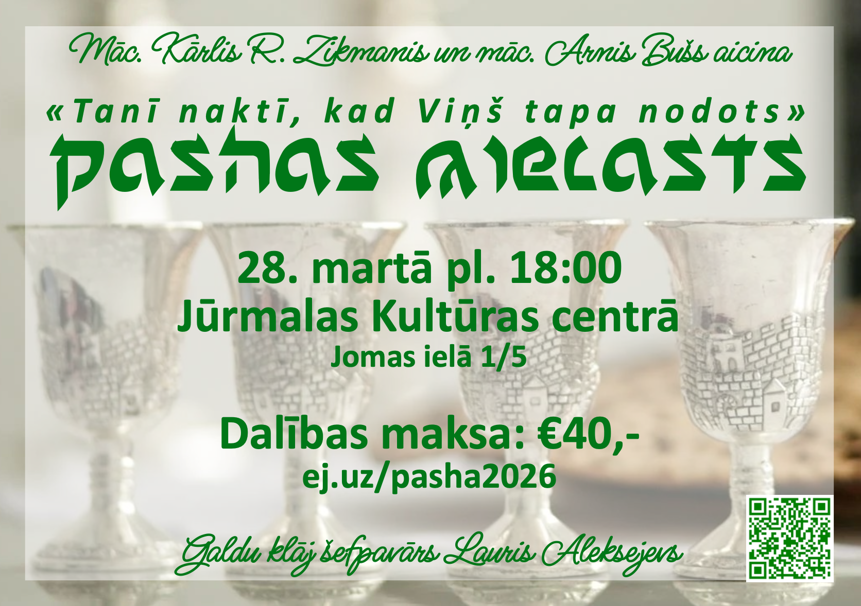 Arī šogad ir plānots Pashas mielasts kopā ar Māc. Arni Bušu un Dubultu draudzi sestdien, 28. martā plkst. 18:00 Jūrmalas Kultūras centrā. Galdu klāj šefpavārs Lauris Aleksejevs. Ziedojums par dalību ir € 40,--. Dalībnieku skaits ir ierobežots! Vairāk informācijas un pieteikšanās: https://ej.uz/pasha2026.
