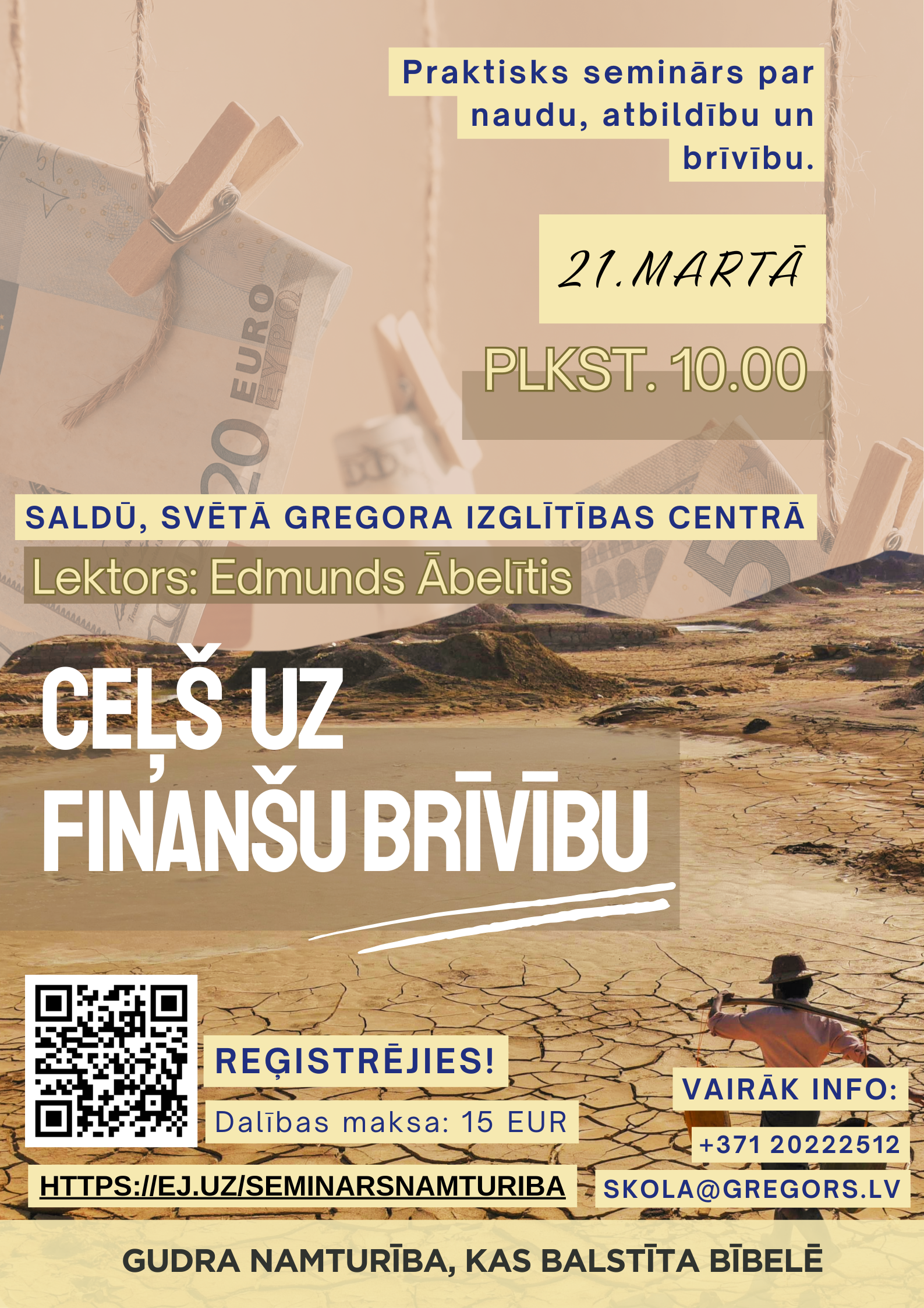 Sestdien, 21. martā, Svētā Gregora izglītības centrā notiks seminārs “Ceļš uz finansiālu brīvību”.