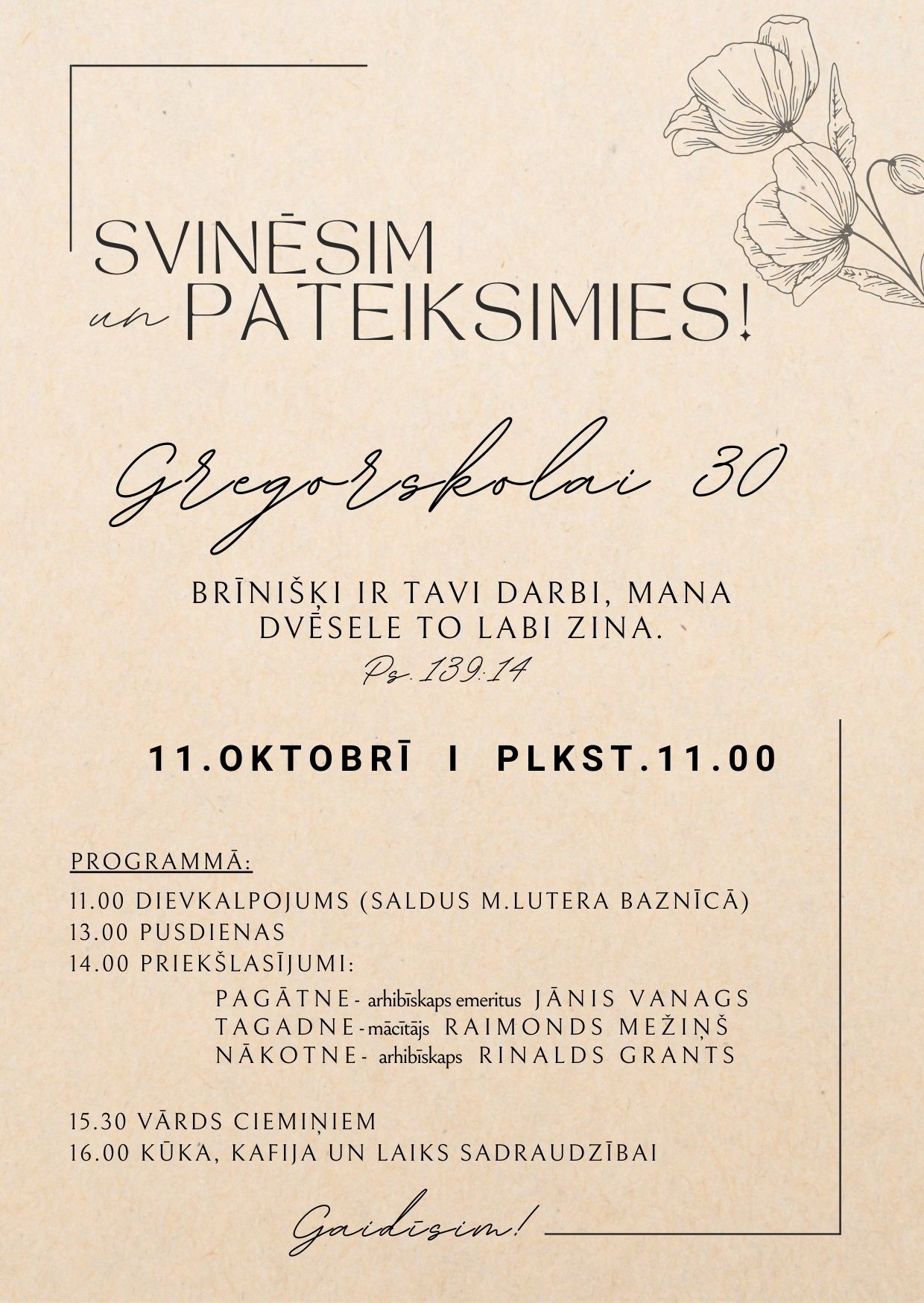 Ar prieku un lielu pateicību Dievam aicinām Gregorskolas absolventus, mācībspēkus un visus draugus uz kopīgām svinībām – Gregorskolas 30 gadu jubileju š.g. 11.oktobrī plkst.11.00.